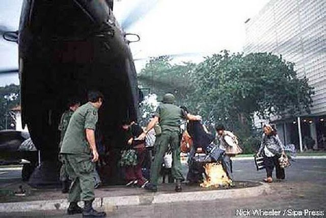 Ngày 30 - 4 - 1975 , việt cọng tiến vào, những người Mỹ cuối cùng với đoàn người di tản đã được những chiếc trực thăng của TQLC Mỹ đưa ra HKMH đang chờ ngoài biển khơi. Chiến tranh VN đã chính thức đi qua